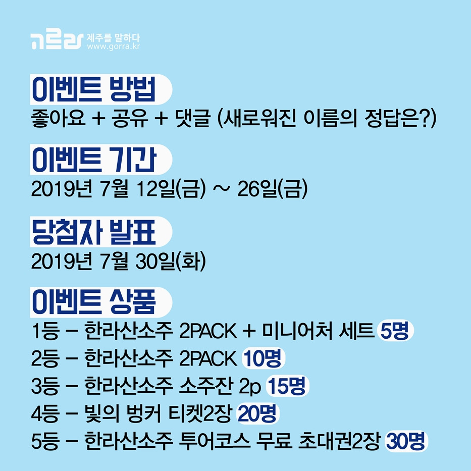 이벤트는 2019년 7월 12일(금)부터 7월 26일(금)까지 진행되며, 당첨자는 2019년 7월 30일(화) 발표된답니다. 고르라 페이스북 채널에 올라온 한라산소주 게시물에 좋아요 + 공유 + 참여 댓글(정답 적기)을 남기면 참가 완료!