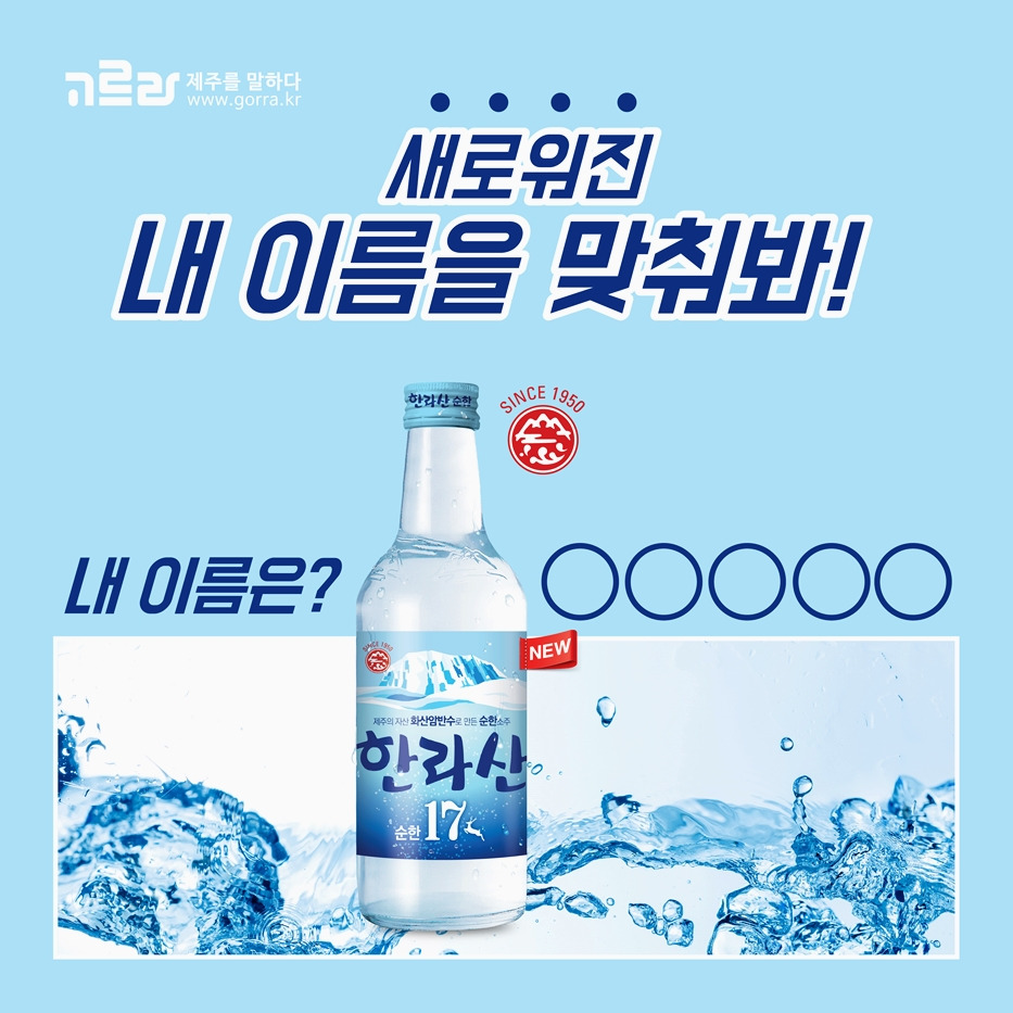 리뉴얼된 한라산소주와 새로 나온 한라산소주 신제품 OOOOO도 맛보고 기분도 낼 수 있는 <새로워진 내 이름을 맞춰봐!> 이벤트! 쉬운 퀴즈니 너무 고심 말고 가볍게 도전해보시기 바랍니다.^^