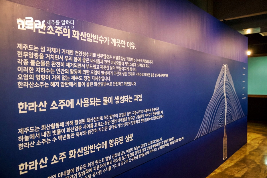 이곳의 대표 제품 한라산21은 제주산 쌀을 원료로 한 증류원액과 화산암반수로 만든 프리미엄 소주인데요. 지하에서 뽑아올려 미네랄 용존산소가 풍부한 알칼리성 화산암반수를 화학처리 없이 자연수 상태로 사용한다고 해요.