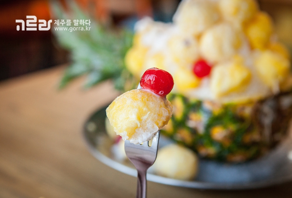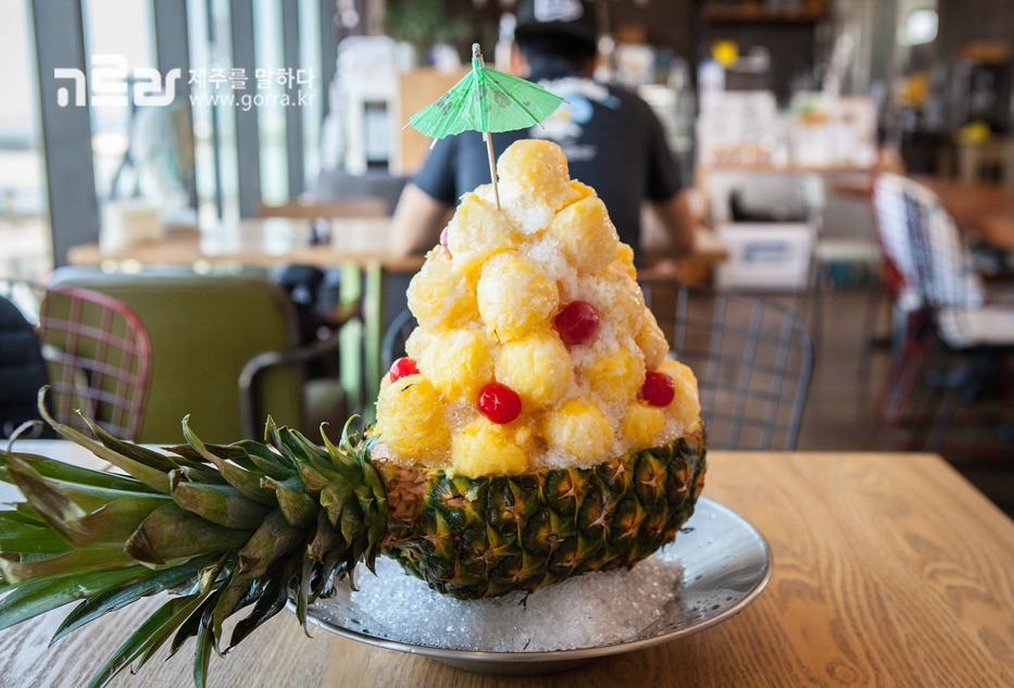 제주 구좌 한동리의 한적한 바닷가를 보며 빙수를 즐길 수 있는 이런날엔 카페. 에메랄드빛 바다를 감상하며 파인애플 하나를 통째로 즐겨보아요~. 파인애플의 상큼함을 고스란히 담은 빙수, 이맛이지!