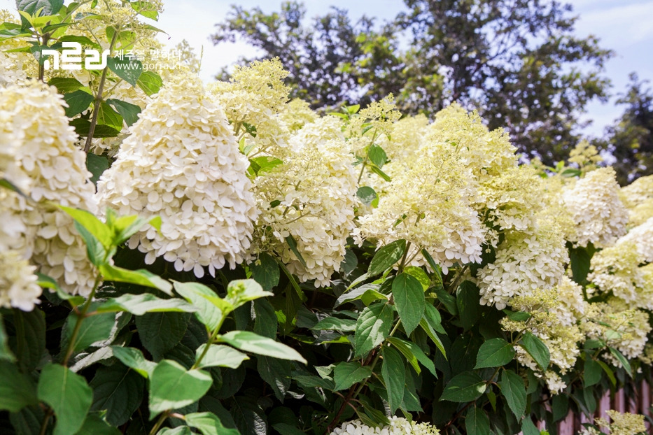 7월 중순을 맞은 마노르블랑은 눈송이를 닮은 흰색 수국으로 한들거리고 있습니다. 하루가 다르게 만개하는 총천연색 수국 더미에서 농익은 여름의 달큼한 향이 풍겨옵니다.