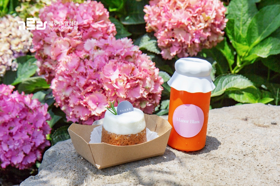이밖에도 이곳에서는 제주산 당근을 통으로 갈아 넣은 달달한 당근주스와 당근케잌을 비롯해 제주를 담은 커피, 음료, 디저트 등을 다양하게 판매하고 있습니다. 7, 8월 싱그러운 여름수국이 가득 펼쳐진 <마노르블랑>에서 당신의 제주를 한 아름 더해가시길.