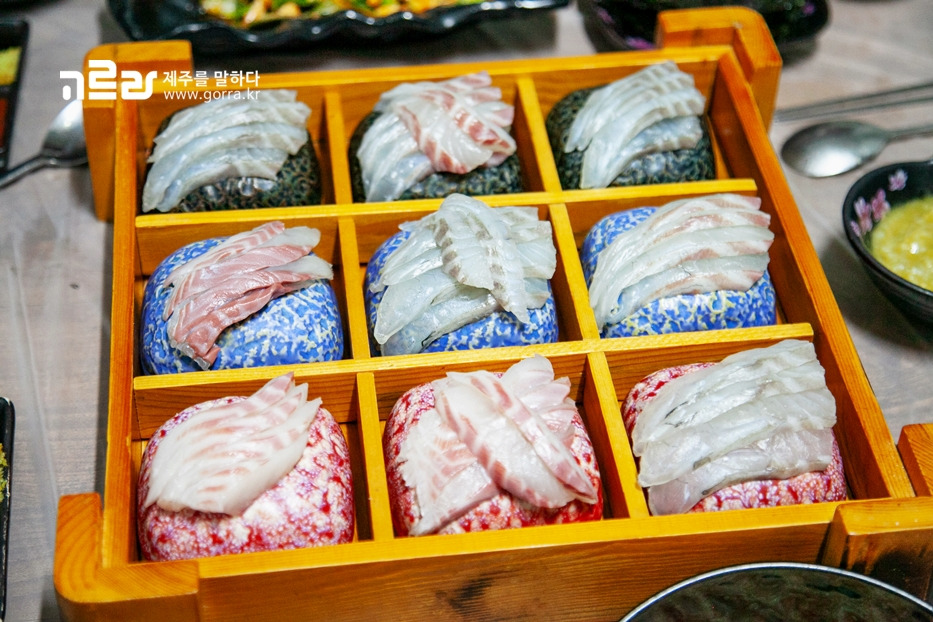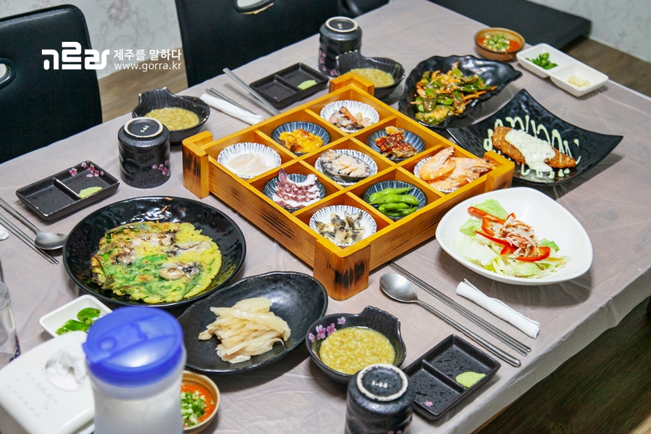 모둠 메뉴는 1차 곁들이찬, 메인 회, 2차 곁들이찬으로 구성돼 있습니다. 먹어도 먹어도 끝이 없는 가지각색 밑반찬과 신선한 회까지. 제주 바다가 한상에 오릅니다.