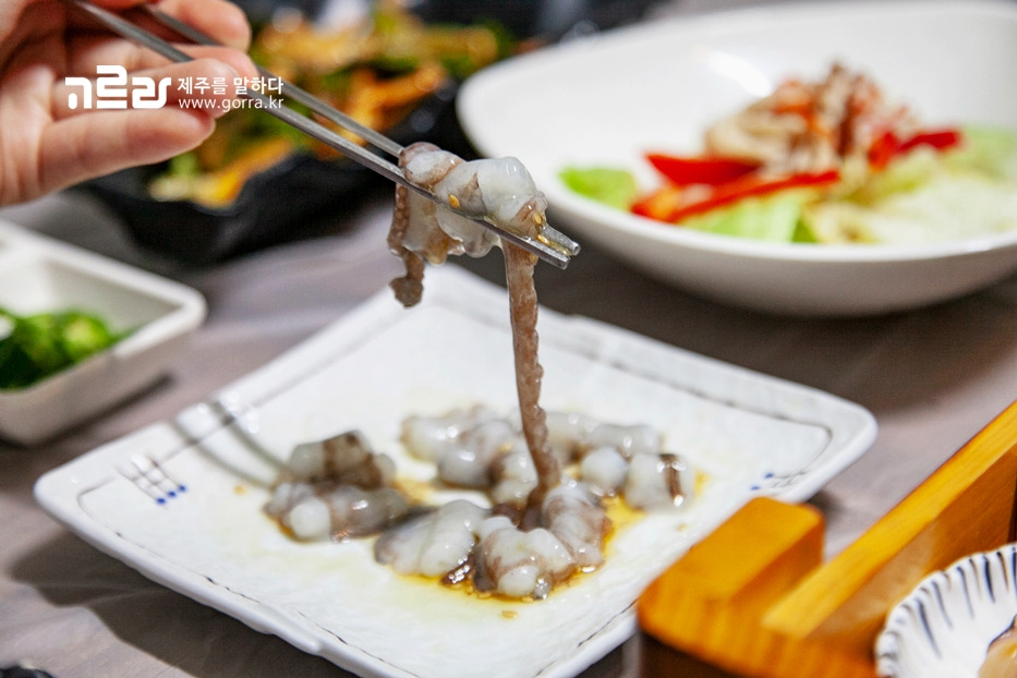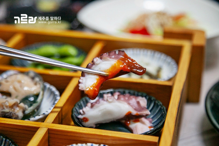 1차 곁들이찬의 경우 멍게, 키조개 관자, 소라 등 9가지가 나오며, 메인회는 벵에돔 등 살이 통통하게 오른 3종류 회로 이뤄집니다. 씹으면 씹을수록 고소한 맛이 강해지는 활어회는 단연 압권입니다.