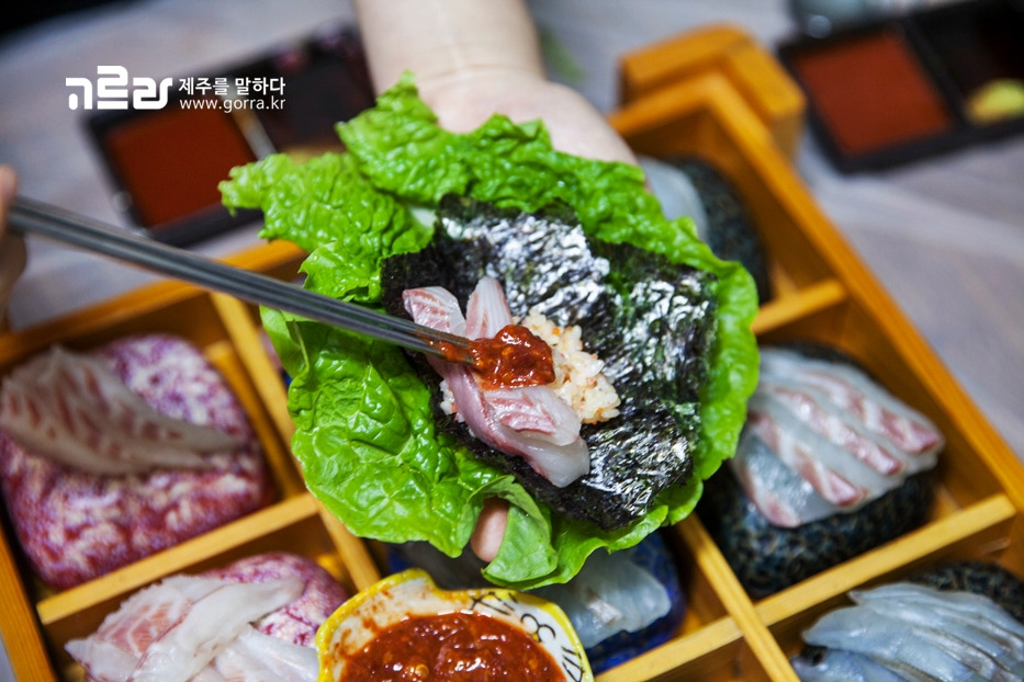 고미횟집에는 맛있는 회를 더욱 맛있게 만들어주는 쌈 비법이 있는데요. 상추/깻잎, 김, 알밥, 갈치속젓, 회. 5가지 맛이 쌈을 통해 "맛있다" 하나로 정리됩니다.