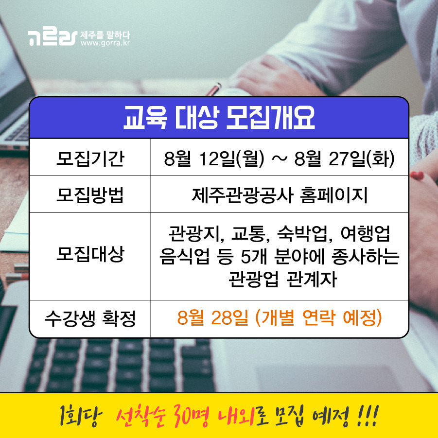 수강생은 1회당 선착순 30명 내외로 받고 있으며, 2019년 8월 28일 개별 연락을 통해 확정된답니다. 궁금한 사항이 있다면 고르라 제주 교육사업부(☎1577-2296, 내선 2번) 또는 제주관광공사(064-740-6944)를 통해 문의해주세요!