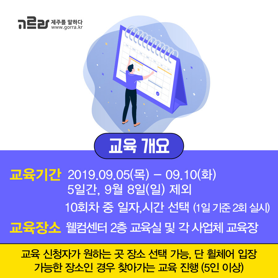 교육 기간은 2019년 9월 5일 목요일부터 9월 10일 화요일까지 일요일을 제외하고 총 5일인데요. 개인 신청자의 경우 웰컴센터 2층 교육실, 5인 이상 단체신청자의 경우 찾아가는 교육으로 진행된답니다.