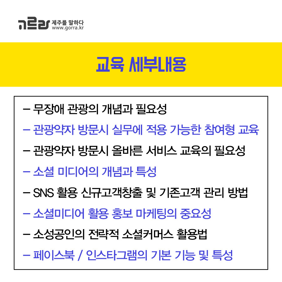 제주관광공사와 고르라 제주가 함께하는 <찾아가는 무장애 관광 서비스 및 SNS 마케팅 교육>! 모집기간이 약 일주일 정도 남아 있으니 관심 있는 분들은 서둘러 신청하시길 바라겠습니다♬