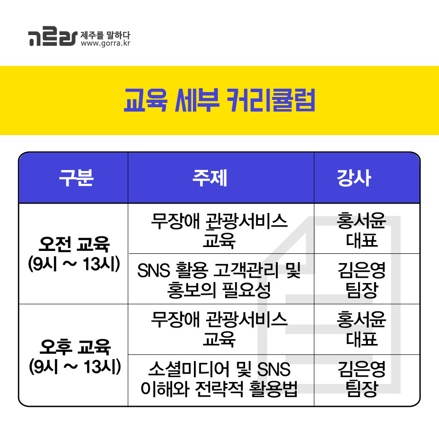 또한 <찾아가는 무장애 관광 서비스 및 SNS 마케팅 교육>의 강사로는 고르라 제주 교육사업부 김은영 팀장과 한국장애인관광협회 대표이자 KBS 최초 여성장애인 앵커 홍서윤 대표가 함께해줄 예정!