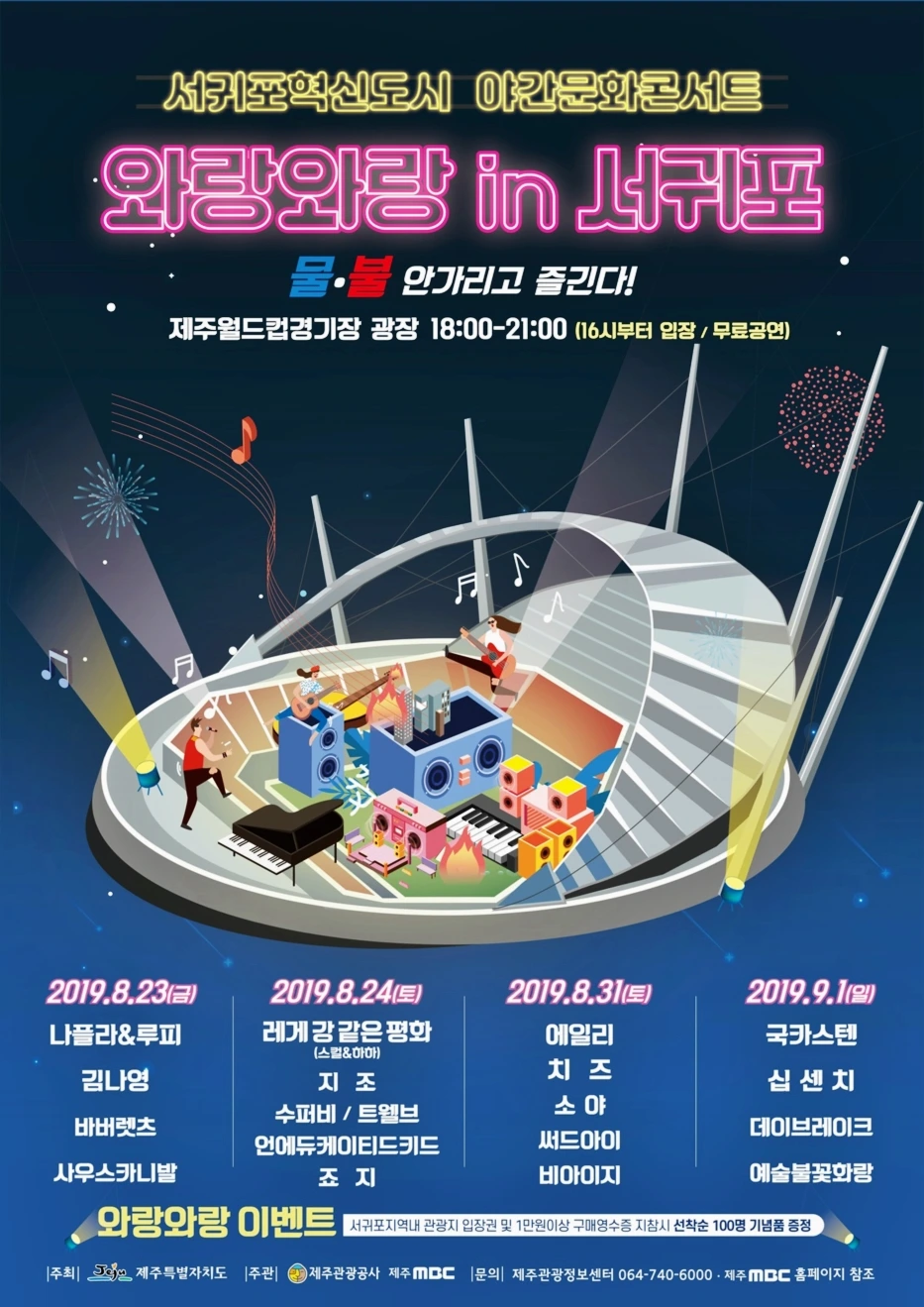 <와랑와랑 in 서귀포>는 2019년 8월 23일(금)과 24일(토), 31일(토), 9월 1일(일) 제주월드컵경기장 광장 특설무대에서 개최됩니다.