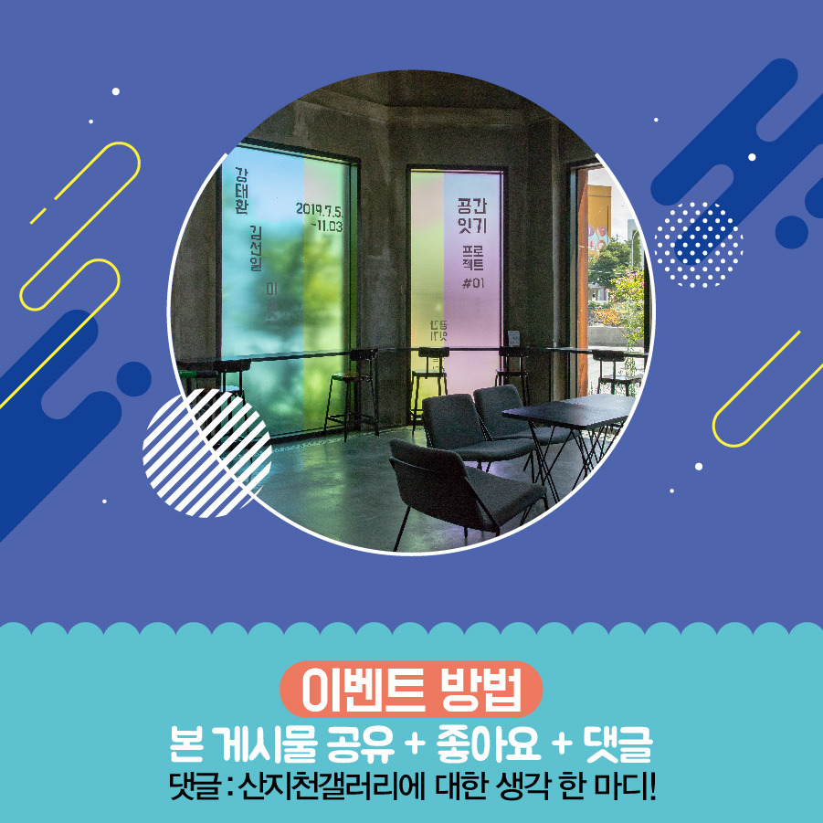 아울러 산지천갤러리 페이스북 이벤트가 2019년 8월 26일(월)부터 9월 13일(금)까지 진행되는데요. 고르라 페이스북 내 산지천갤러리 게시물을 댓글+좋아요+공유하면 30명을 추첨해 문화상품권 3만 원씩을 증정하는 이벤트랍니다.