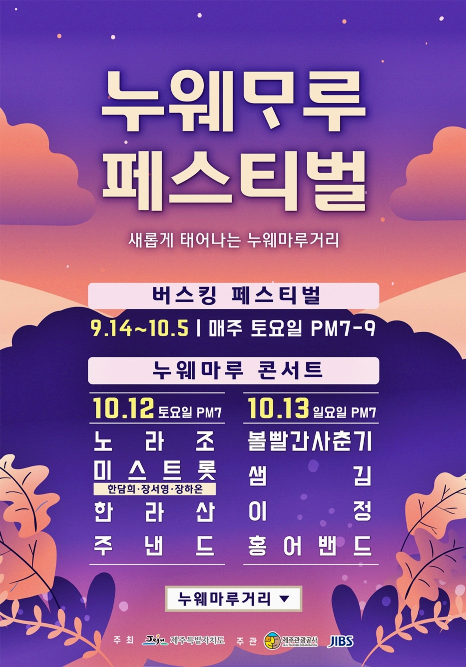 9월 신제주 누웨마루 거리(구 바오젠거리)에서는 가을 낭만을 더하는 버스킹 축제가 열립니다. 제주 로컬 아티스트들이 재즈, 팝, 포크, 알앤비, 힙합 등 다양한 음악 공연을 매주 토요일 펼치는데요. 버스킹 페스티벌이 끝난 뒤 10월 12~13일에는 국내 인기 뮤지션들이 무대에 오르는 누웨마루 콘서트도 열린답니다.