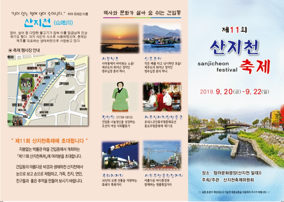 제주의 오랜 역사가 녹아 있어 그 자체로 '지붕 없는 박물관'이라 불리는 제주시 건입동! 산지천축제는 아름다운 건입동을 배경으로 앙상블, 난타, 라틴댄스, 미니콘서트, 제주어 경연, 노래공연, 칠머리당영등굿 등 풍성한 프로그램으로 진행될 예정이에요.
