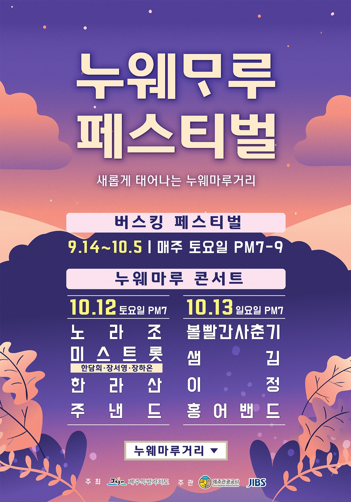2010년 제주시 연동에 조성된 차 없는 거리인 누웨마루거리는 제주도에서 꼭 가봐야 하는 쇼핑의 메카로 불리는 곳인데요! 젊음이 가득한 이곳에서 달콤한 가을의 밤을 즐길 수 있는 페스티벌이 열립니다. 볼빨간사춘기부터 노라조까지 개성 넘치는 뮤지션들과 젊음의 거리를 채워보는 건 어떨까요?!