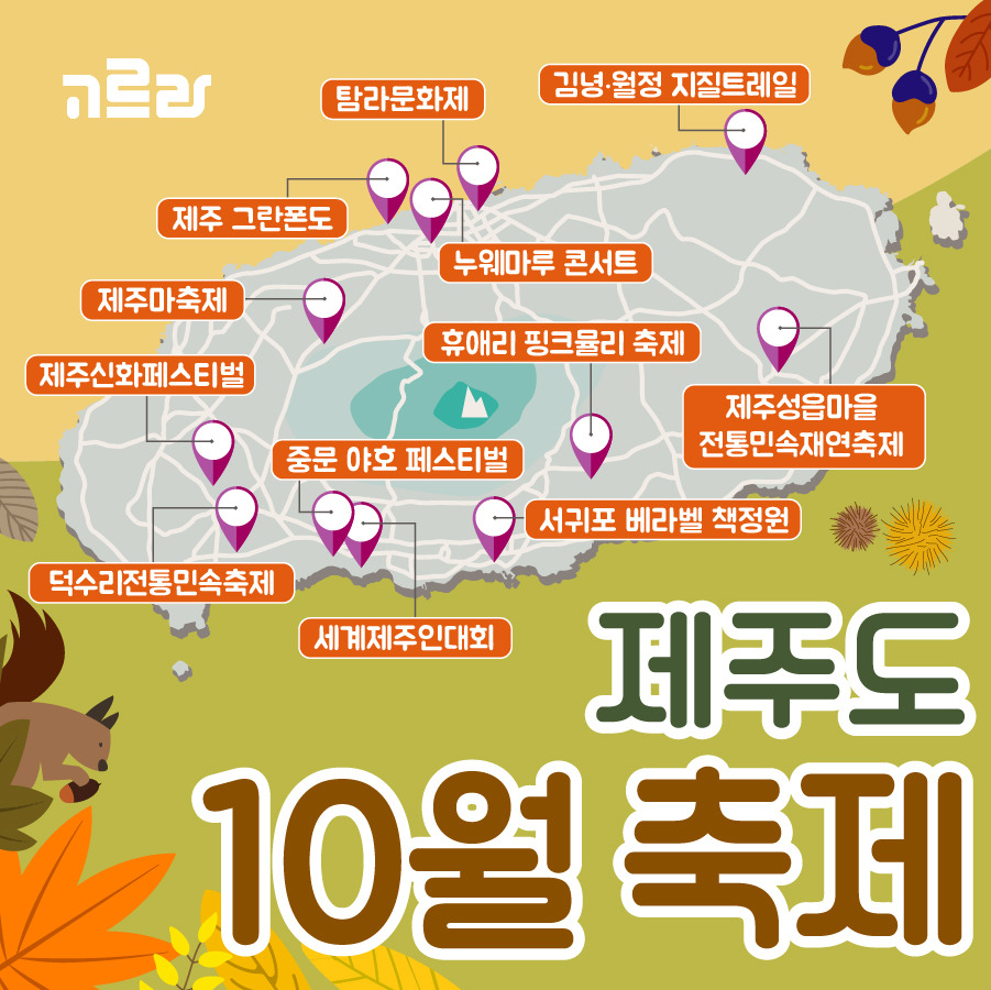 풍성한 한가위를 보내고 나니 본격적인 가을을 알리는 10월이 다가왔습니다! 낙엽이 빨갛게 익어 가는 가을! 고르라가 모아 온 <제주도 10월 축제>로 기분 좋은 바람과 함께 떠나볼까요?