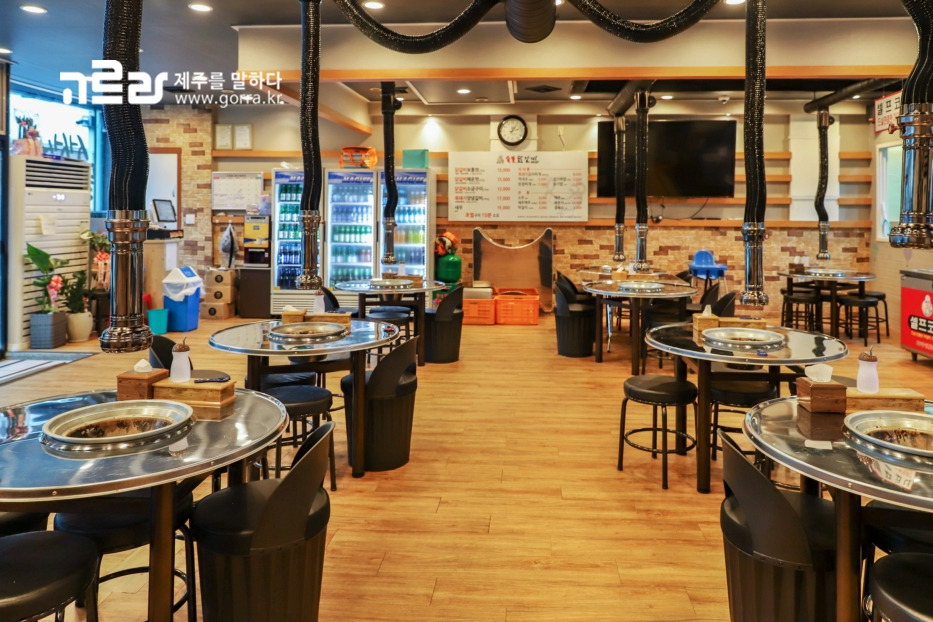실내에는 입식테이블이 넉넉하게 마련돼 있습니다. 가방이나 옷가지에 고기 향이 덜 배도록 자리마다 수납형 의자가 준비돼 있는 점이 세심합니다.
