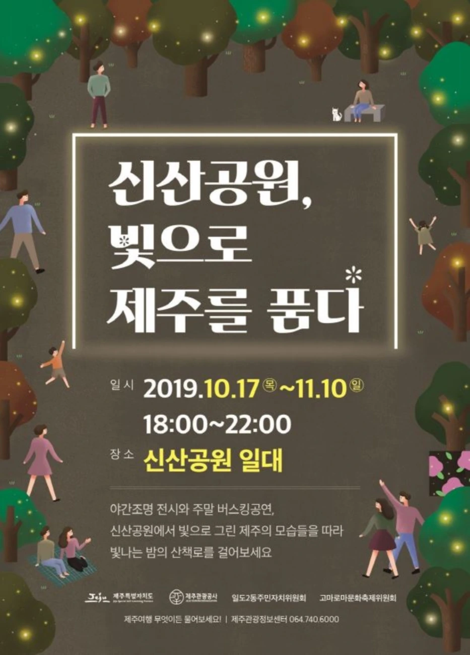 주민들의 산책 코스였던 신산공원이 색다른 공간으로 변신했습니다. 제주의 모습을 빛으로 표현한 야간조명 전시와 주말 버스킹 공연 등이 진행 중이랍니다. 신산공원 동쪽 진입로 250m 구간에 꾸며진 밤의 제주를 만나보세요.