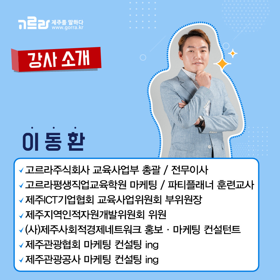 이번 온라인 마케팅 교육을 진행해주실 강사님을 소개합니다. 이동환 강사는 고르라 주식회사 교육사업부 총괄이자 전무이사로 수많은 경험을 통해 쌓은 노하우로 꽉 찬 교육을 진행해주실 예정!