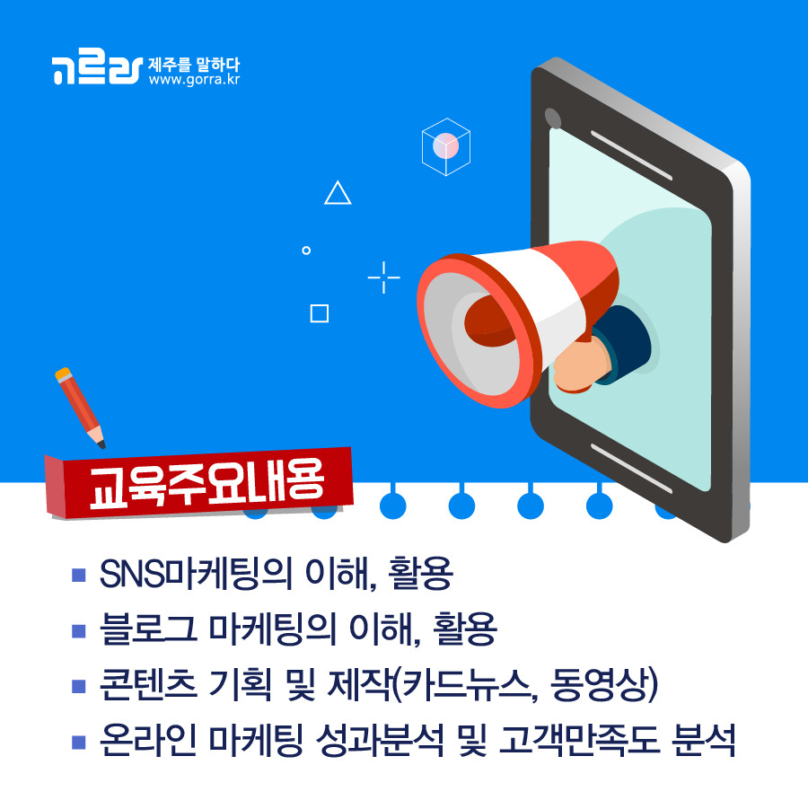 온라인 마케팅 홍보전략 교육은 'SNS 마케팅의 이해', 'SNS 마케팅 활용', '블로그 마케팅의 이해와 활용', '콘텐츠 기획 밋 제작(카드 뉴스, 동영상)', '온라인 마케팅 성과분석 및 고객만족도 분석'으로 총 5개 주제로 진행될 예정인데요.