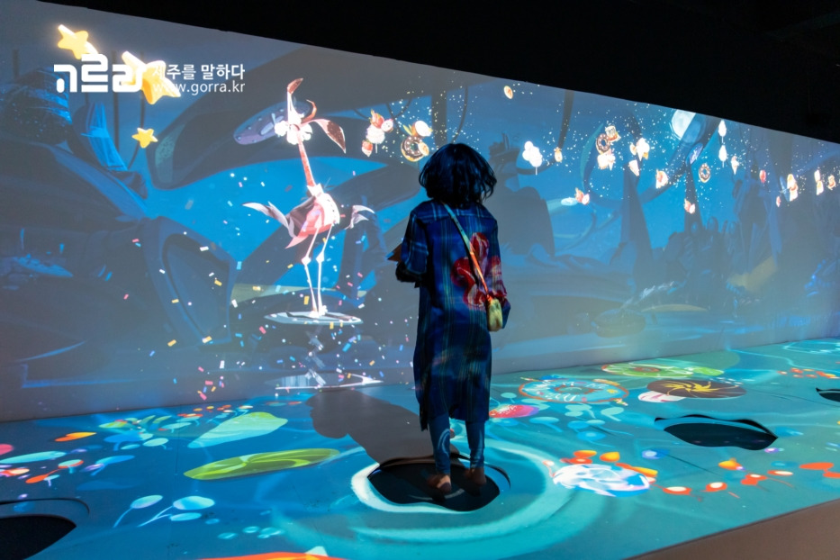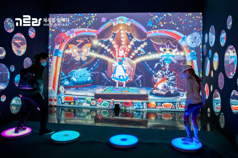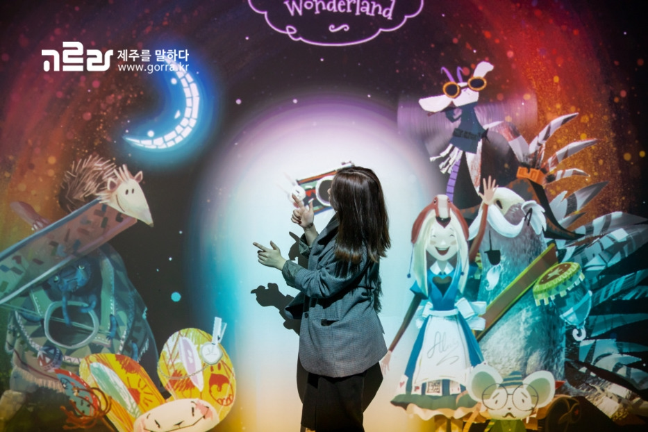 500여 평 규모에 4200만 화소 컬러 프로젝션을 사용해 제주 속 이상한 나라를 생생하게 구현했는데요. 여러 사용자가 동시에 플레이할 수 있는 대화형 스크린 기술과 명작의 스토리텔링을 접목해 12개 섹션을 다채롭게 구성했습니다.