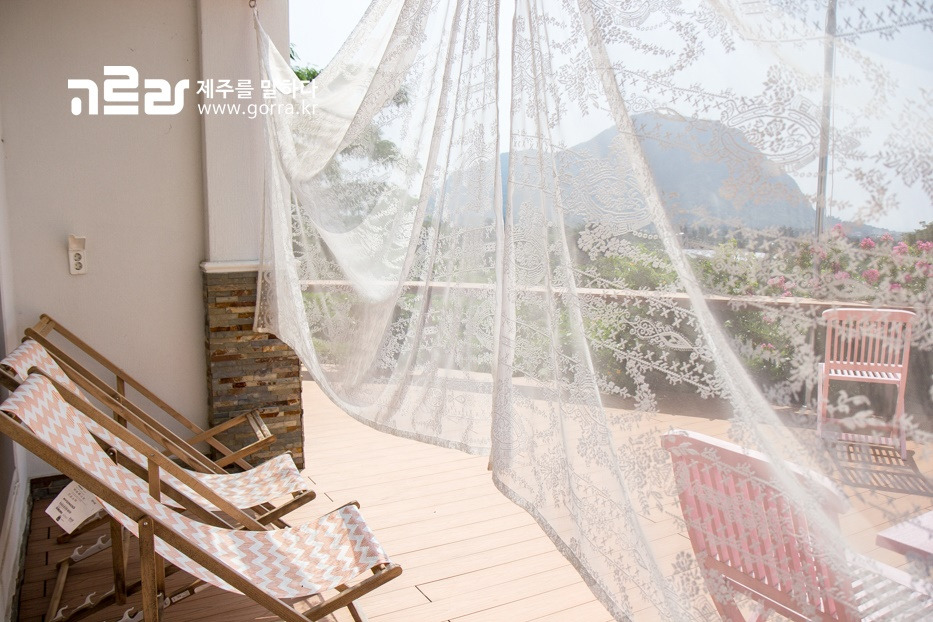 넓은 정원을 둘러보고 난 후엔 야외 테라스에 앉아 따스한 햇살과 선선한 바람을 즐겨보는 것도 좋을 것 같습니다. 기분 좋게 기대 누워 편안한 휴식을 취하기 좋은 안락의자와 강렬한 햇빛을 살포시 가려줌과 동시에 분위기를 더해주는 레이스가 살랑이고 있답니다.