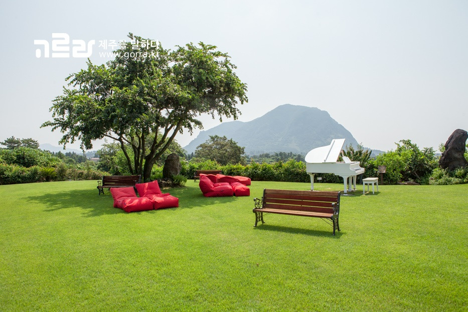 다양한 콘셉트의 넓은 정원을 보유하고 있는 마노르블랑. 그중에서도 힐링하기에 최적화되어있는 곳이 바로 그랜드 피아노와 샌딩백이 놓여있는 정원이 아닐까 싶습니다. 높은 건물 하나 없이 탁 트인 전망의 마노르블랑. 산방산과 형제섬, 송악산까지 한눈에 볼 수 있는 곳으로 가만히 앉아 아름다운 자연에 취해, 포근한 날씨에 취해 하루를 즐기기 좋은 공간입니다.