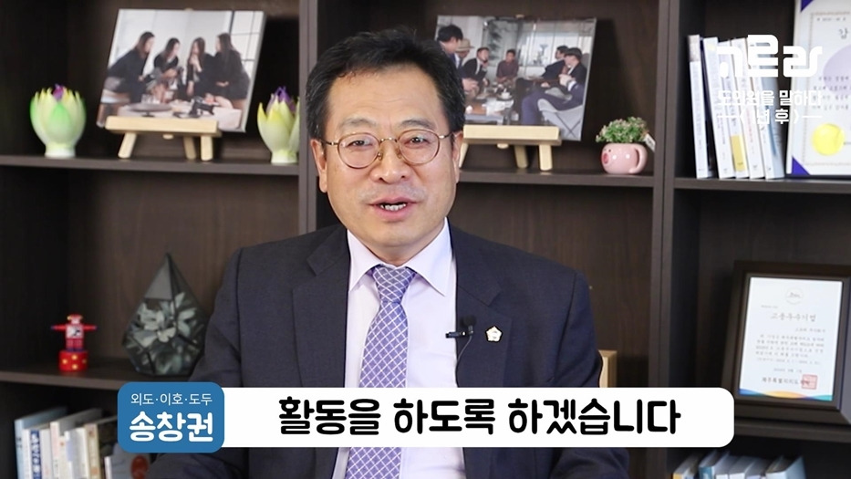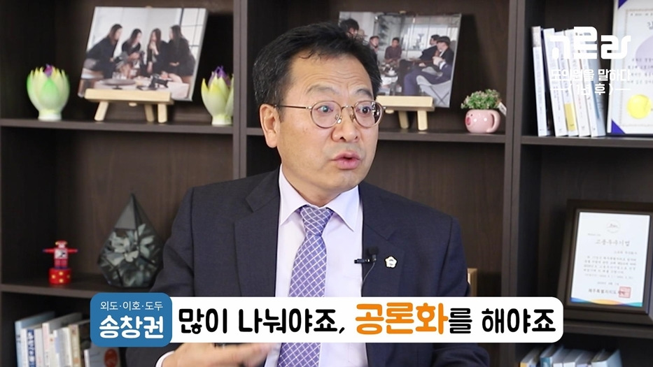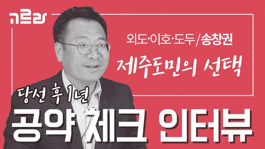 고르라가 특별한 인터뷰를 준비했습니다. 2018년 6.13 제주 지방선거 후 당선자들을 응원하고 공약을 알리기 위해 고르라가 준비했던 <도의원을 말하다>를 기억하시나요? 그 후 1년이 지난 지금, 공약 이행 확인을 위한 기습 인터뷰를 요청했는데요! 고르라가 직접 만나 1년 후 공약 체크 인터뷰 시간을 가졌답니다. 그 첫 번째 시간은 외도·이호·도두 지역구에 더불어민주당 소속 송창권 의원입니다.