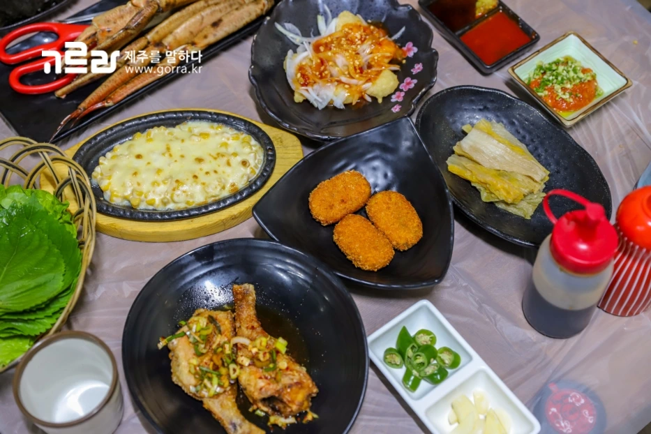 2차 안주로는 깐쇼새우, 콘치즈, 자연산 대게, 옥돔구이, 해물누룽지탕, 크로켓, 튀김 등과 지리 또는 매운탕이 나온답니다. 메인회까지 배부르게 먹고도 새로운 상이 차려지는 모습에 마음까지 든든해집니다.