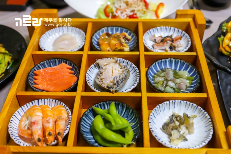 1차 안주로는 메인에 전복회, 새우, 멍게회, 키조개 관자, 소라회 등 9가지 해산물이 나오며, 사이드로 전복죽, 게살 샐러드, 부침개, 초무침, 생선가스 등이 나옵니다. 서비스로는 전복버터구이, 산낙지 등이 제공됩니다.