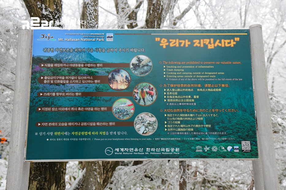 겨울 내내 우리에게 다양한 즐거움을 주는 한라산! 그만큼 우리도 지켜야 할 몇 가지들이 있는데요~ 자신이 가져간 쓰레기를 함부로 버린다거나, 식물을 채집하거나, 지정되지 않은 장소에서 취사를 하는 것 모두 자연을 해치는 행동이라는 걸 알아주셨으면 합니다!