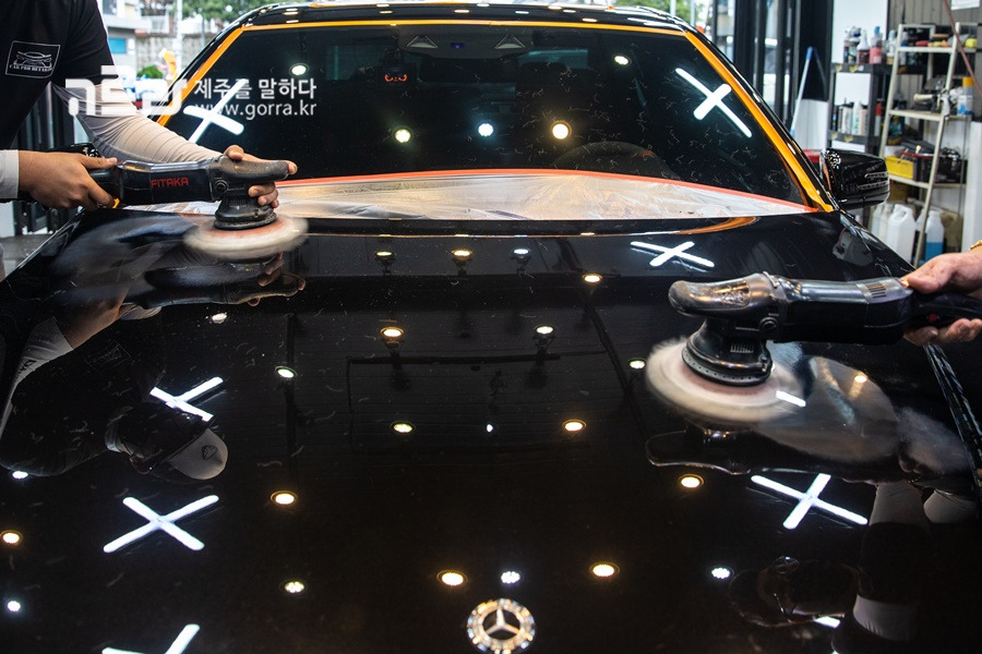광택 준비가 끝나면 도장면 광택이 진행되는데요. 도장면에 있는 스크래치 골까지 깎아내어 표면을 고르게 만들어 주고 광을 내는 작업을 진행하면 오래된 먼지, 타르, 스크래치, 스월마크 등이 제거되면서 깨끗하고 반짝거리는 외관이 나타납니다.