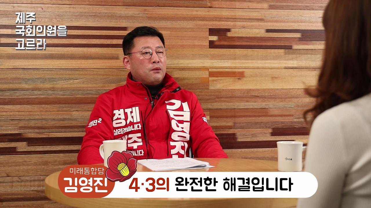 첫 번째 공약은 4.3의 완전한 해결입니다. 4.3특별법이 국회에서 처리되지 않고 현재 계류 중인데 아마 자동 폐기될 것으로 알고 있습니다. 저는 4.3유족으로서 4.3특별법이 새롭게 국회에서 발의되고 통과될 수 있도록 우선적으로 노력할 것입니다. 4.3의 분명한 해결을 통해 도민사회의 화해와 상생을 이끌어 내야 됩니다. 그 화해와 상생이 결국 제주의 미래를 위한 성장 동력이 될 것입니다.