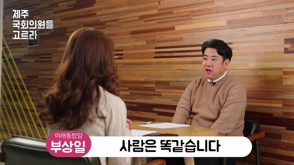 안녕하세요. 제주시 을 선거구 국회의원 예비후보자 부상일입니다. 저는 새로 만들어진 미래통합당 예비후보로 등록을 했고요. 이번이 네 번째 도전입니다. 38살에 시작해서 올해 50살이 되었으니 12년 동안 줄곧 이 길을 달려왔습니다.