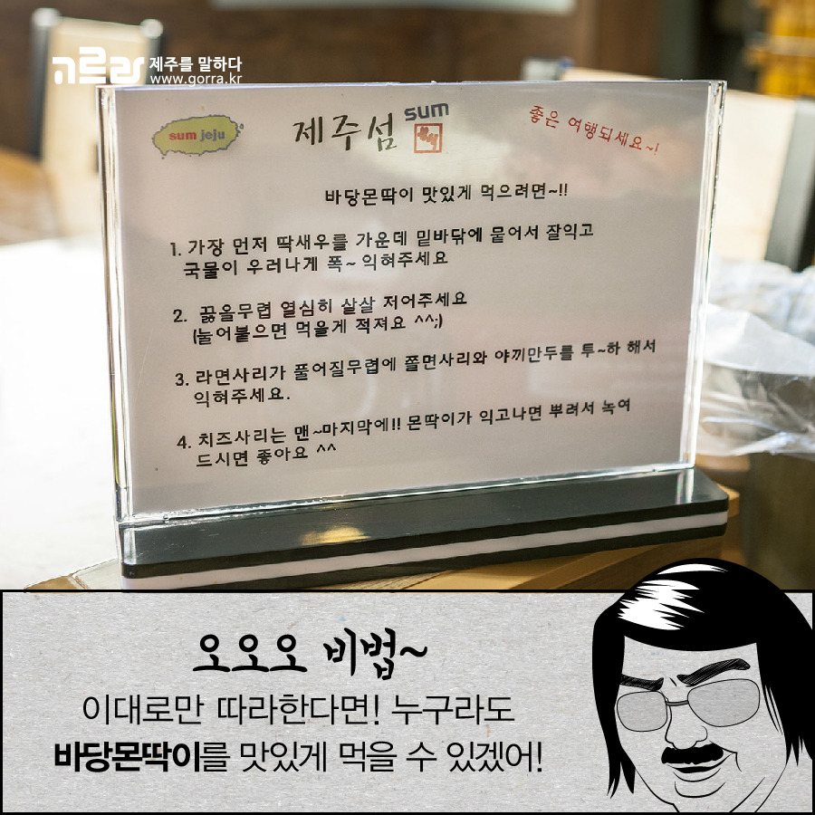 떡볶이를 주문하고 테이블에 앉으면 확인할 수 있는 제주섬분식의 바당몬딱이 맛있게 먹는 방법! 이런 팁이 테이블에 하나씩 있는 곳은 왠지 모를 믿음이 가는데요~ 한 가지 메뉴라도 가장 맛있게 먹었으면 좋겠다는 사장님의 마음을 담겨 있기 때문이겠죠?
