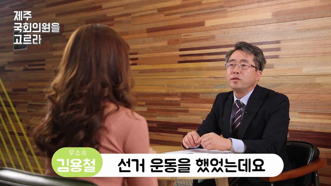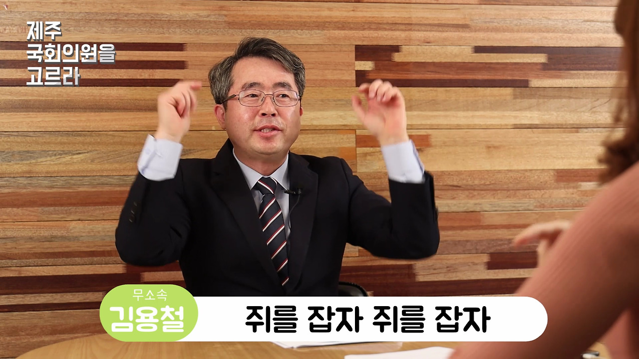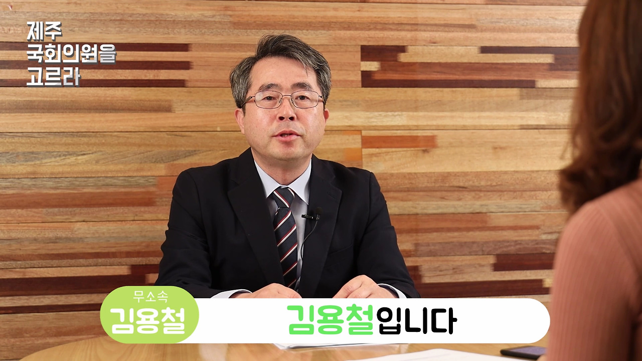 반갑습니다. 이번 국회의원 선거 제주시 갑 지역구에 무소속으로 출마한 김용철 예비후보입니다. 나이는 54, 노형동에 삽니다. 저는 이번이 4번째 도전입니다. 국회의원 준비만 20년 정도 했습니다. 많이 준비되었으니까 여러분들의 많은 관심 부탁드립니다. 고맙습니다.