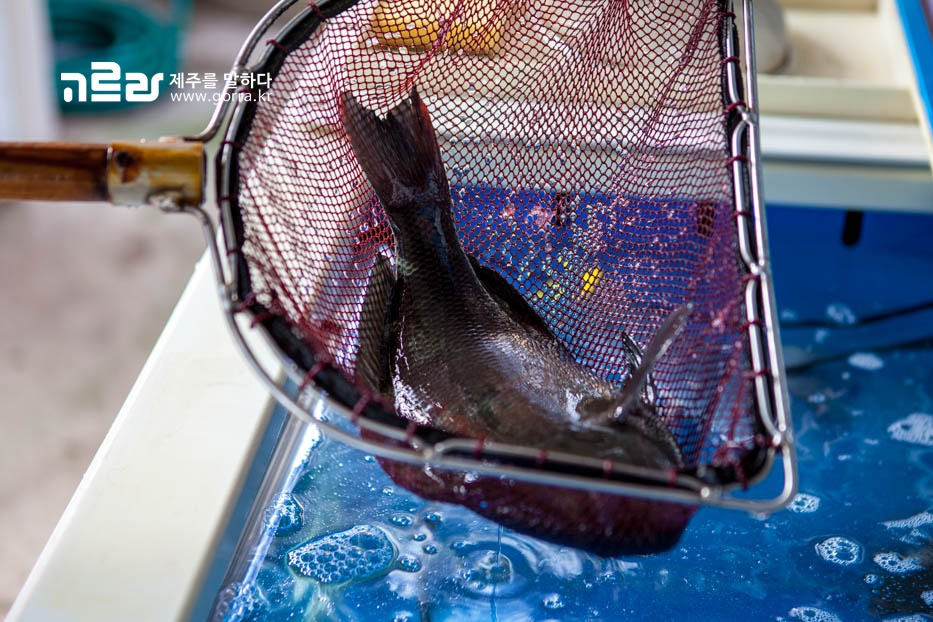 메뉴를 고르고 나면 사장님은 밖으로 저벅저벅 투박한 발걸음으로 걸어가서는 수족관에 있는 싱싱한 고기를 한 번에 읏차- 하고 잡아 올립니다! 사장님 뒤쪽으로 놓여진 빨간 물통에 고기가 들어가고 나면,