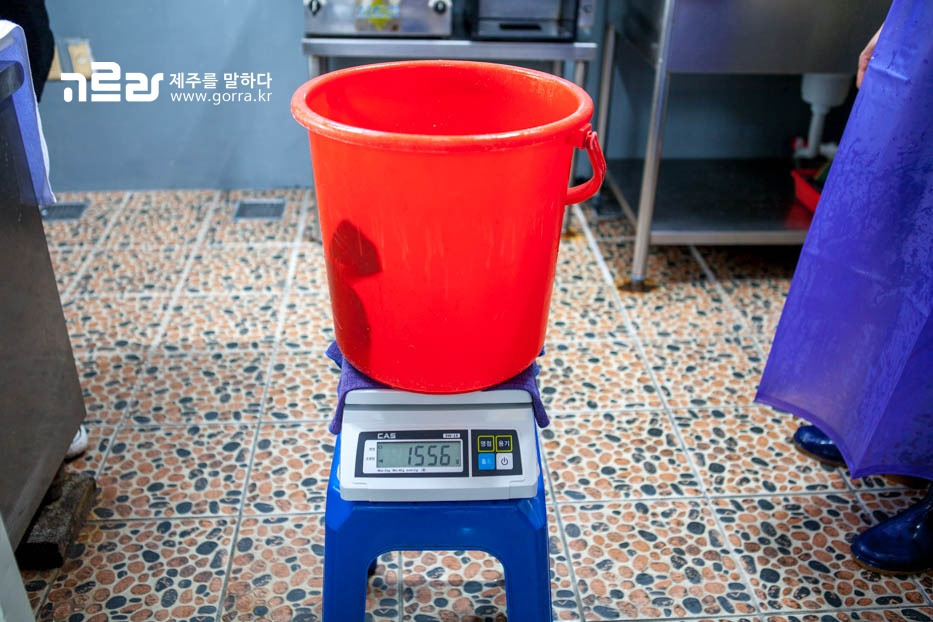 매장 안쪽에서는 다시 무게가 책정되는데요. 니모회센타에서는 이 모든 과정을 사장님 뒤를 졸졸졸 따라다니면서 함께 볼 수 있다는 사실! 빨간 물통의 무게를 빼는 과정까지 거치고 나면 준비 완료!