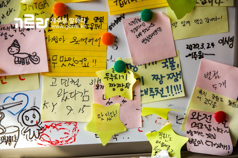 가게 입구에서 가장 먼저 만나는 방명록. 많은 사람들이 이곳에서 고향의 맛을 느끼고 간 흔적들입니다. 이곳에서 어른들은 추억의 맛을, 아이들은 집밥과는 또 다른 따스한 한 끼를 즐깁니다.
