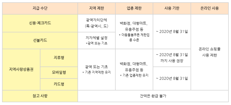 지급 수단은 신용·체크카드, 선불카드, 지역사랑 상품권이며 사용기간은 20.8.31일까지이며 백화점, 대형마트, 유흥주점, 온라인 쇼핑몰에서는 사용 불가합니다. 잔액 또한 환급 불가하며 자세한 내용은 위 표를 참고하세요.