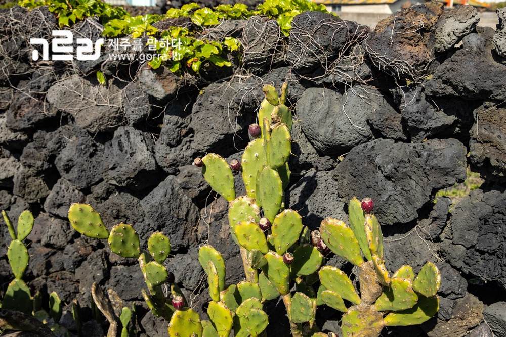 돌담에 선인장이 자생하게 된 이유는 여러 가지 설이 있지만 열매나 줄기 등이 쿠로시오 난류를 타고 월령리 해안으로 밀려와 모래땅이나 바위틈에서 야생하게 된 것으로 추정된다고 해요. 또한 월령리 마을에서는 뱀이나 쥐가 들어오는 것을 막기 위해 집 돌담에 심었는데 그것이 마을 전체에 퍼지게 되었다는 이야기가 있답니다.