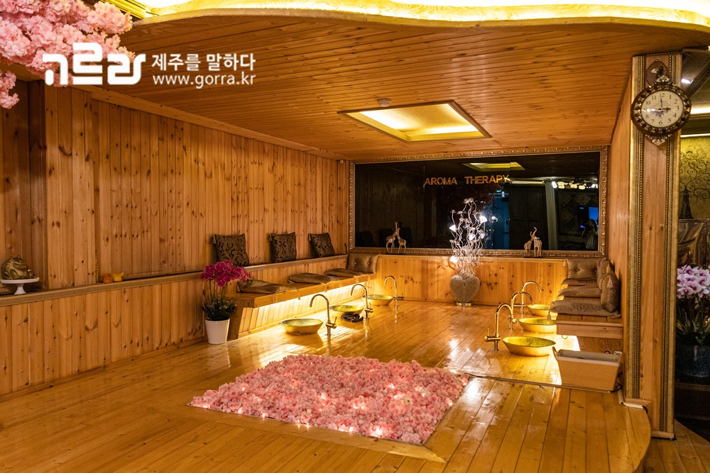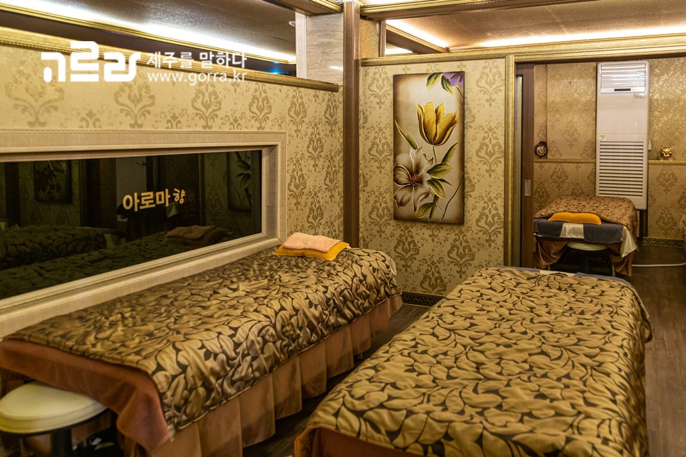 지역 특성상 관광객들을 위한 마사지샵이 많은 제주도! 수많은 마사지샵 중에서도 사랑받는 <아로마향>은 황금빛 인테리어가 한몫하는데요. 요리보고 저리 봐도 황금빛이 가득한 이곳에서 받는 마사지는 그 어느 때 보다도 황홀한 분위기를 연출해준답니다.