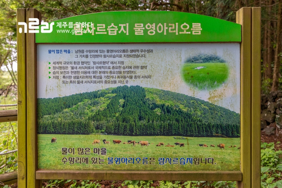 이곳은 산정호수가 있는 제주 오름 중에서도 경관적 가치와 보존 가치가 높은 오름으로 평가받는다. 다양한 희귀 습지 동식물들이 이곳에 둥지를 틀고 있다. 지난 2007년 물영아리는 그 가치를 인정받아 람사르습지로도 지정되었다.