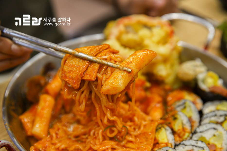 매콤 달콤 새빨간 양념이 더해져 침샘을 마구 자극하는 비주얼을 자랑하는 제주분식 모닥치기! 말 그대로 떡볶이부터 김밥, 순대, 튀김, 면사리 등이 조화롭게 어우러져 있는 모습인데요. '맛있는 거+맛있는 거=더 맛있는 거' 법칙을 안다면 진정 먹을 줄 아는 사람.