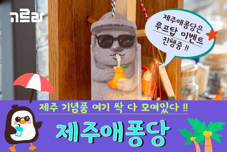 제주를 기록하는 방법 중 대표적인 방법은 기념품이 아닐까 싶은데요! 오늘 고르라가 소개하는 <제주애퐁당>은 제주를 간직하기 좋은 곳으로, 기념품 쇼핑과 루프탑의 낭만을 즐길 수 있는 곳이랍니다. 고르라와 함께 낭만적인 기념품샵으로 함께 떠나보시죠!