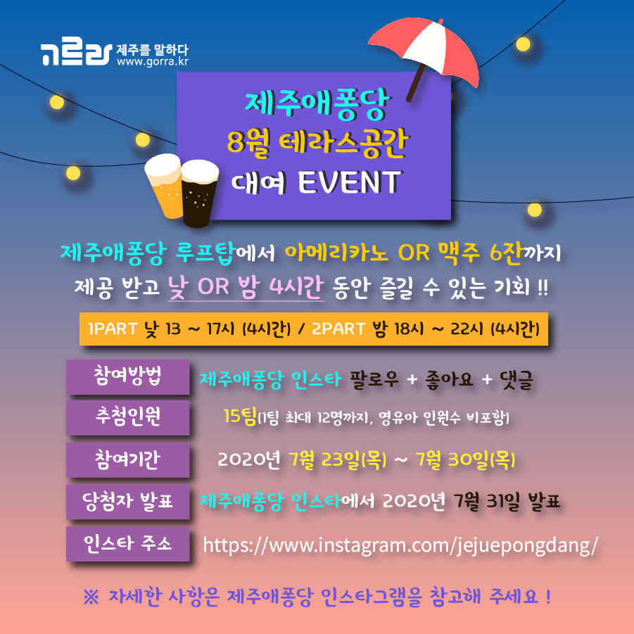 당첨자에게는 아메리카노 or 제주맥주 6잔까지 기본 제공된다는 사실! 또한 배달음식 및 주류 반입이 가능하니 한여름의 낭만을 실현하기에 부족함이 없겠죠! 단, 미성년자는 2part 이용이 불가하지만 보호자가 있을 시 가능! 자세한 사항은 제주애퐁당 인스타그램을 참고하세요!