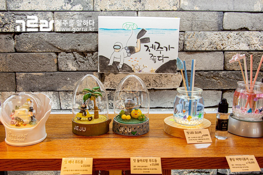 이곳의 기념품은 각종 문구류, 캔들, 무드등, 스노우볼, 마그넷, 가방, 옷 등등 제주도를 테마로 한 핸드메이드 소품으로 가득 채워져 있으며, 제주 먹거리까지 한 번에 만나볼 수 있다는 사실!