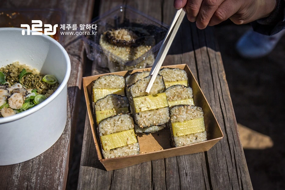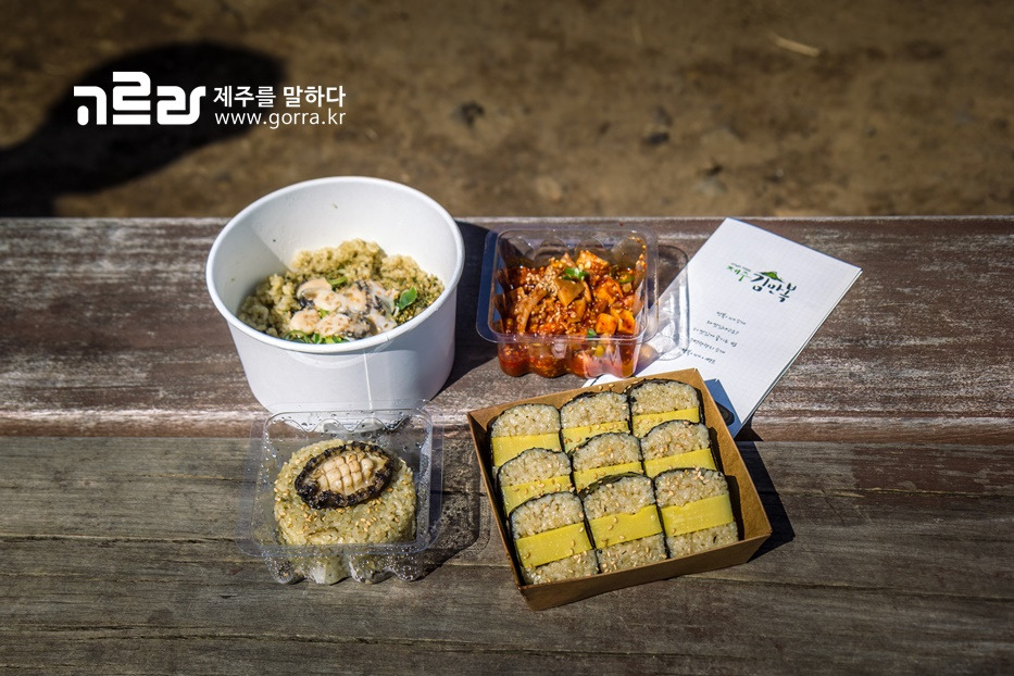 전복 컵밥보다 더욱 간편하게 즐길 수 있는 메뉴를 찾는 분들은 만복이네김밥은 어떨까요? 고소한 게우밥 사이에는 도톰한 계란이 들어있는데요, 일반 계란과는 다른 제주김만복만의 독특한 계란 맛으로 게우밥과 찰떡궁합을 보인답니다. 한입에 쏙 넣기 좋아 먼 거리를 이동하는 동안 차 안에서 혹은 간식으로 간단하게 즐기기 좋은 메뉴랍니다.