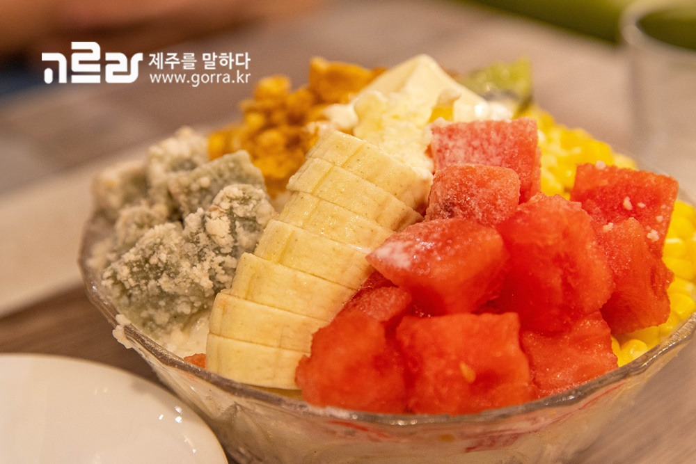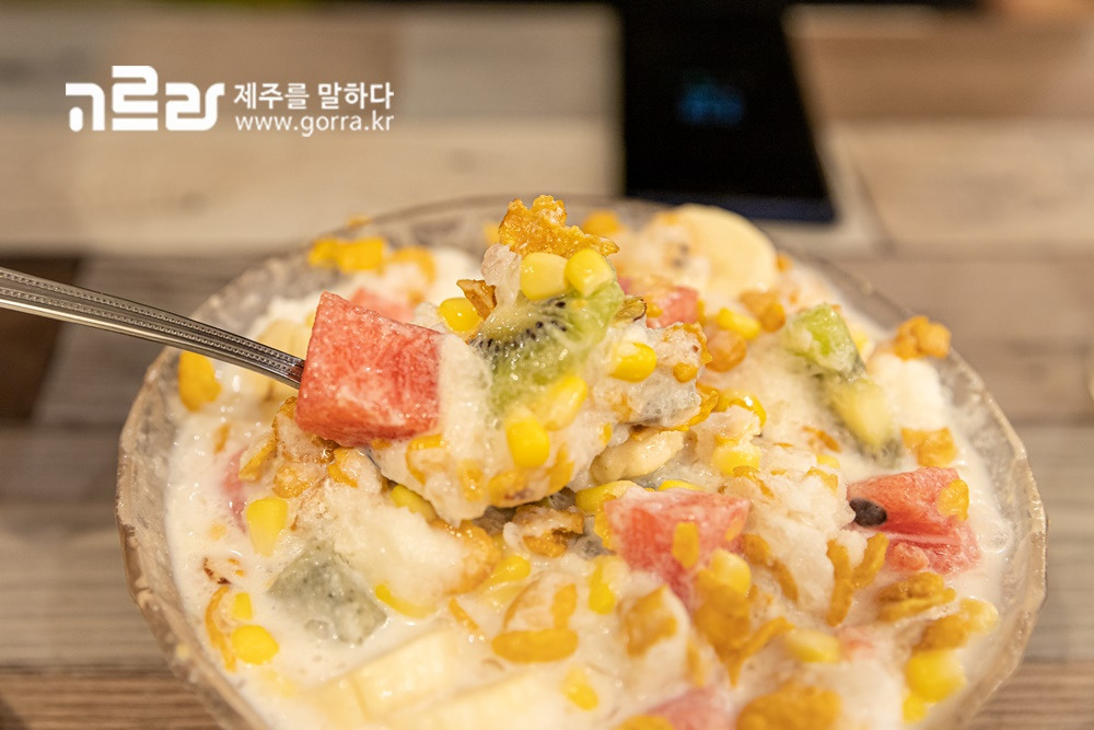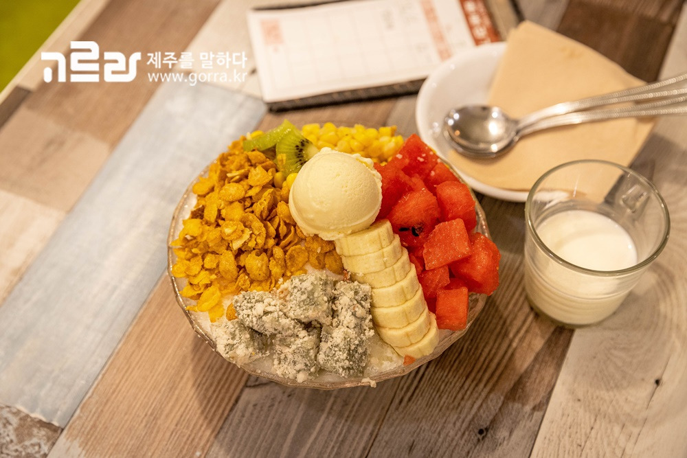 고르라는 제주시청점에서 요거트 빙수를 먹었는데요. 빙수마다 맛있게 먹는 방법이 다른데 요거트 빙수는 빙수 위에 올려진 아이스크림을 꼭 먼저 먹고, 우유를 넣은 후 얼음이 부드러워질 때까지 잘 섞어서 먹기! 단, 얼음을 녹이지 말고 먹어야 제맛! 여러분도 이곳을 찾는다면 메뉴별 맛있게 먹는 방법을 꼭 참고하셔서 더욱 맛깔나게 드시길 바라요.