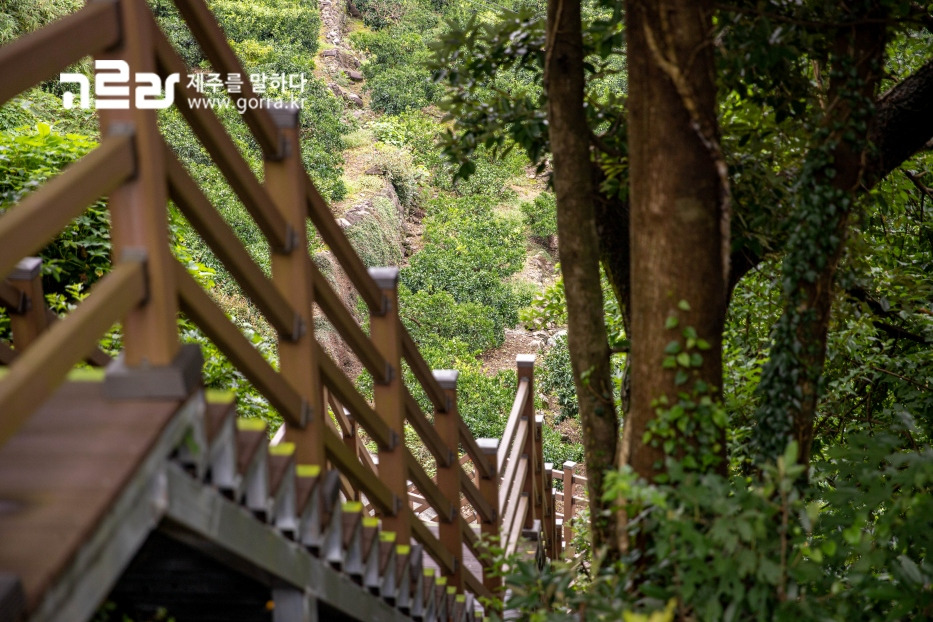 도착하면 분화구를 한눈에 내다볼 수 있는 전망대부터 모습을 드러냅니다. 위가 아닌 아래를 향해 내려가야 하는 분화구의 특성상 전망대부터 시작하게 되는 독특한 코스입니다. 전망대에서 하논 전경을 감상한 뒤 우측 계단을 따라 아래로, 아래로 내려갑니다.