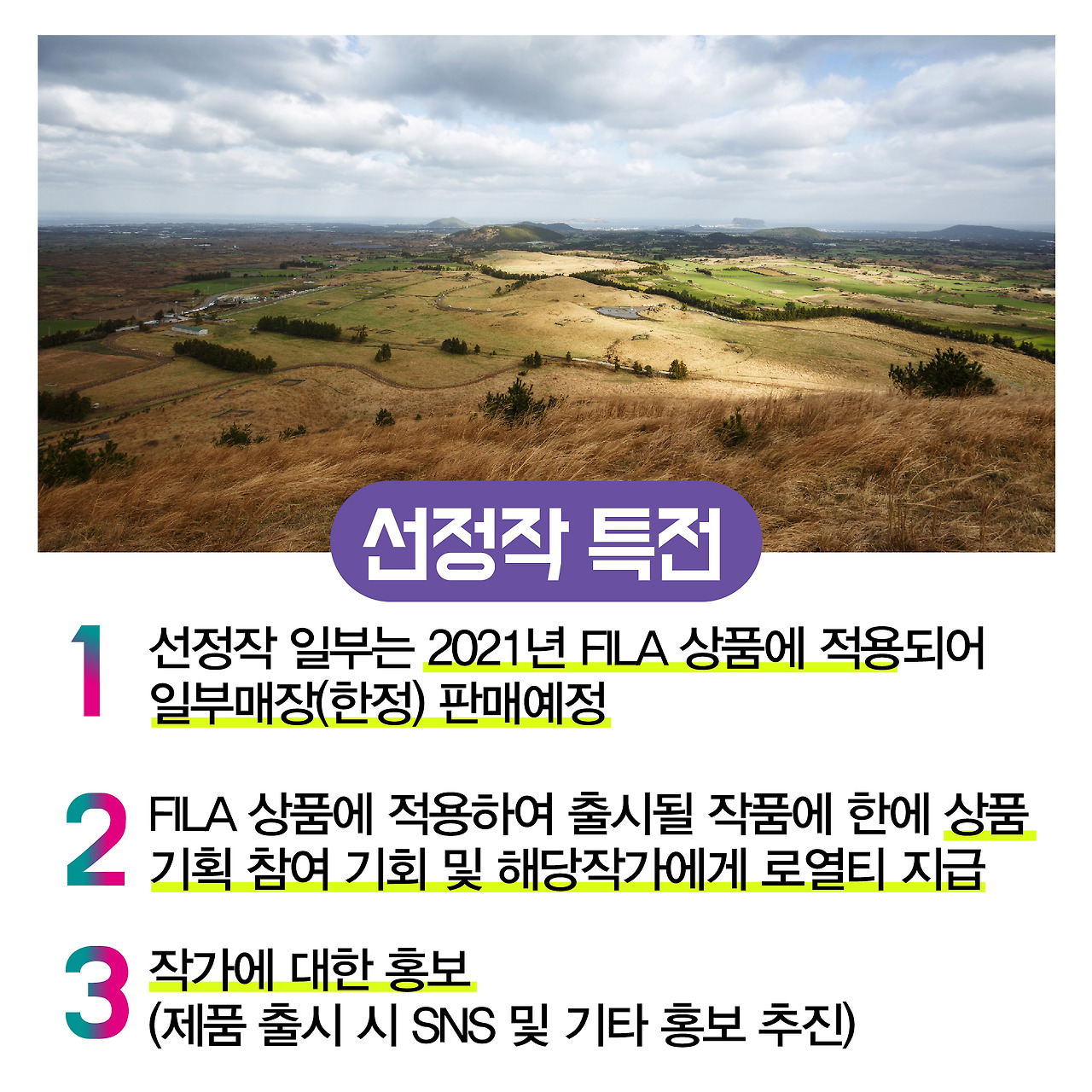 특히, 이번 공모전에 선정된 작품의 일부는 2021년 FILA 상품에 적용되어 일부 매장(한정)에서 판매될 예정인데요. FILA 상품에 적용하여 출시될 작품에 한에서는 상품기획 참여 기회를 제공 하며 해당 작가에게는 로열티도 지급된답니다.